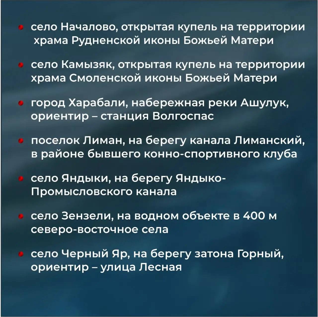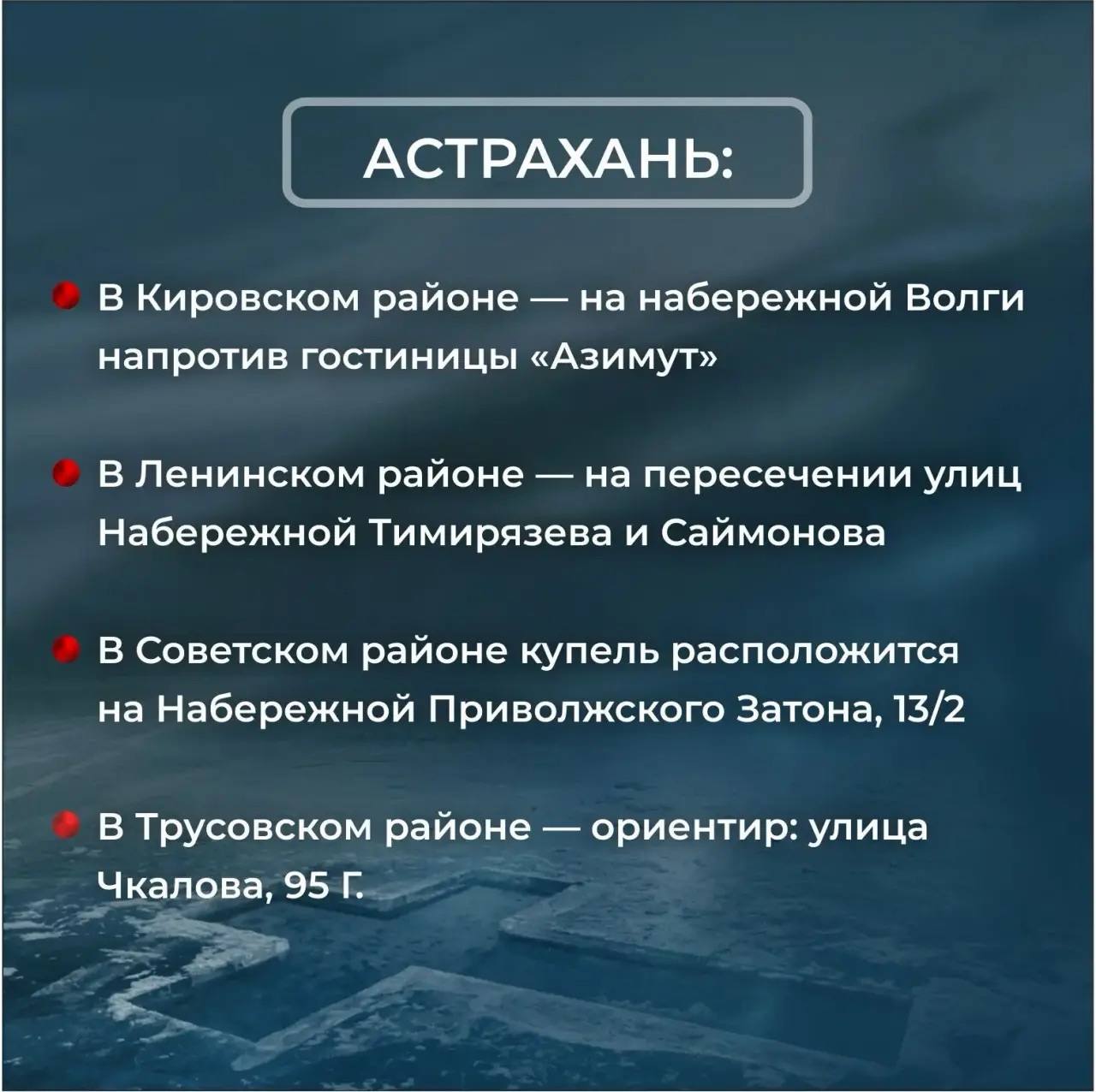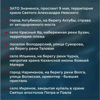 Адресные ориентиры по санкционированным местам для крещенских купаний, оборудованных на территории всей Астраханской области, представила пресс-служба губернатора.