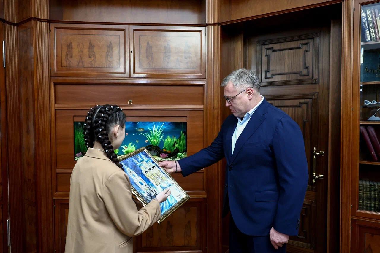 Она хорошо учится, играет в шахматы, поёт, танцует и прекрасно рисует. Одну из своих картин девочка подарила главе региона. Ответным подарком для неё стал набор для творчества из его рук.