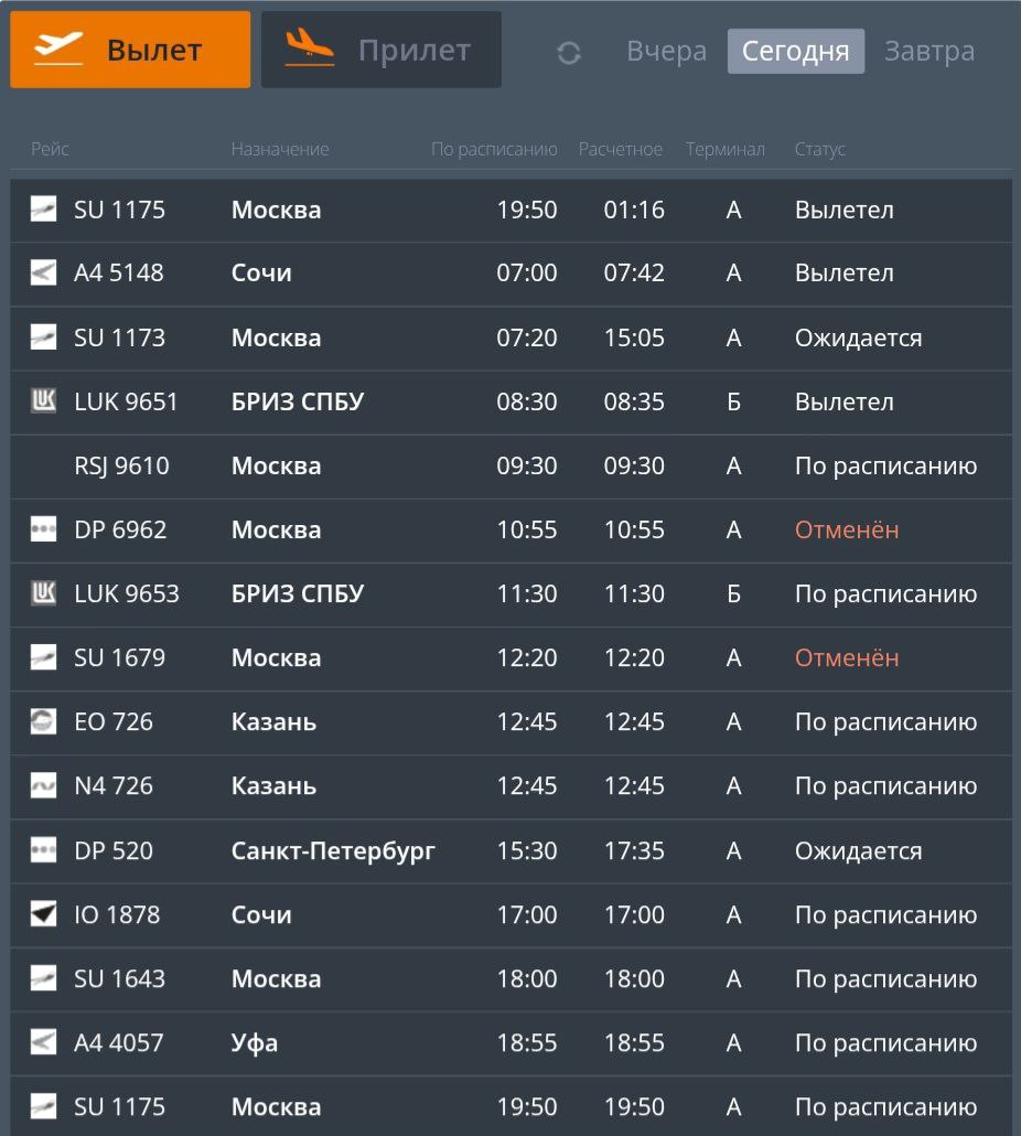 В частности, это рейсы авиакомпаний «Победа» (10:55) и «Аэрофлот» (12:20), которые должны были вылететь в аэропорт «Шереметьево».