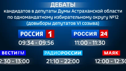 С 24-го августа ГТРК “Лотос” предоставляет кандидатам в депутаты Думы Астраханской области (а всего их 7) равные возможности для участия в теле- и радио дебатах на каждом из своих источников вещания: на телеканалах “Россия 1”, “Россия 24”, а также радиоканалах “Вести ФМ”, “МАЯК” и “Радио России”.