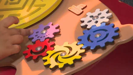 «Вот, например, "сухой дождь". Это дождик из ленточек, в которых ребёнок может спрятаться во время игры. Когда он, например, устал и хочет побыть наедине с собой. Также здесь есть зеркало, он может полюбоваться на себя, отдохнуть. И потом, когда он будет готов, он выходит и снова вступает с нами в игру», − рассказывает психолог Юлия Черепнева.